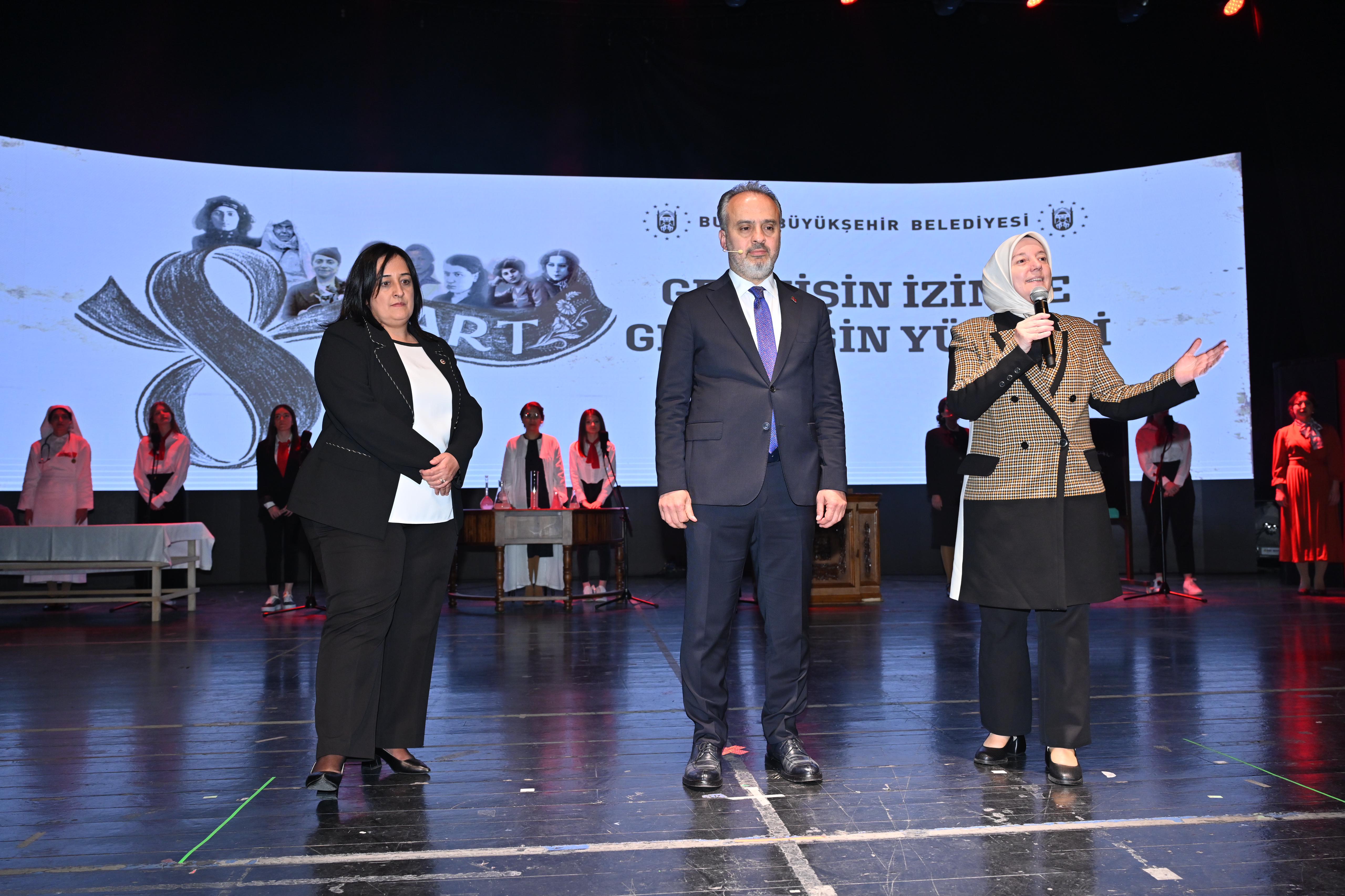 Gösteri sonrası sahneye çıkan Büyükşehir Belediye Başkanı Alinur Aktaş, tüm kadınların 8 Mart Dünya Kadınlar Günü’nü kutladı. ‘Ana başa taç imiş, her derde ilaç imiş, bir evlat pir olsa da, anneye muhtaç imiş’ diyen Başkan Alinur Aktaş, “Kadınlar anadır, yardır, eştir, kardeştir, abladır. Kadın, bu toplumun en asli ve en sağlam unsurlarından bir tanesidir. Cumhuriyetimizin 100’üncü yılını geride bıraktık ve yeni bir yüzyıla başladık. Biz artık çok daha güçlü bir ülkeyiz. Cumhuriyetimizin ilk yıllarındaki tüm büyüklerimizi de rahmetle anıyorum. Tiyatro gösterisinde de genç kızlarımız onların izinden gideceklerinin sözünü verdiler. Ülkemizin gücünü, kadınların gücünü göstermek istedik. Şehrimiz Bursa’da da birçok güçlü ve başarılı kadın var. Hepsi bizim için ayrı ayrı kıymetli ve değerli. Kadına şiddet uygulayan veya kadını ötekileştiren tüm anlayış ve zihniyeti reddediyoruz. Toplumun temel direği olan kadınlarımızın, Dünya Kadınlar Günü kutlu olsun” dedi.