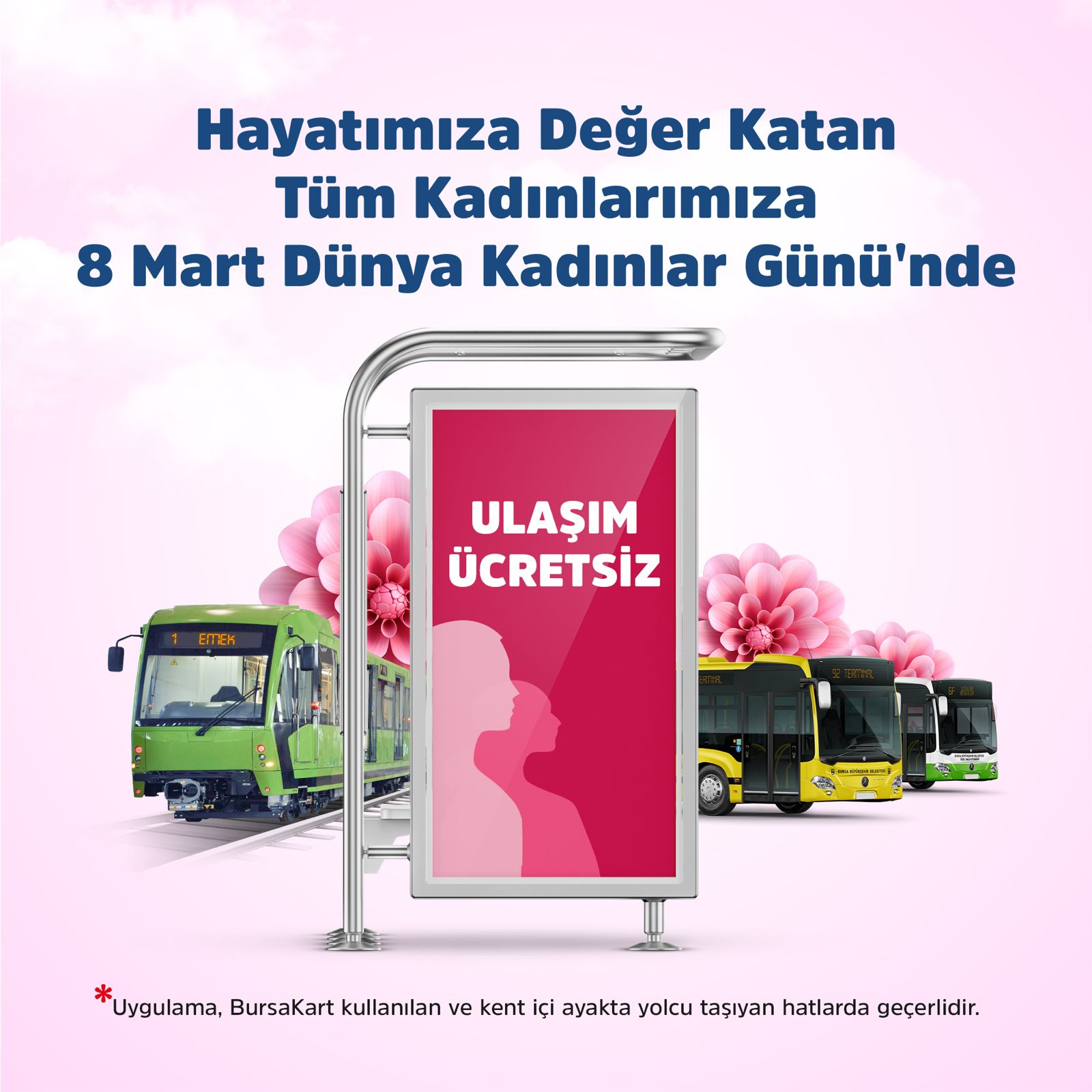 Bursa’da toplu ulaşım, 8 Mart’ta kadınlara ücretsiz olacak. BursaRay, tüm Burulaş otobüsleri, tüm özel halk otobüsleri ve ilçelerdeki halk otobüslerine yönelik yapılan ücretsiz ulaşım uygulaması, ilçeler ile Bursa şehir merkezi arasındaki hatlar ve turistik hatlarda geçerli olmayacak. Kadınlar, uygulamadan ‘Bursakartlarını okutarak’ yararlanabilecek.