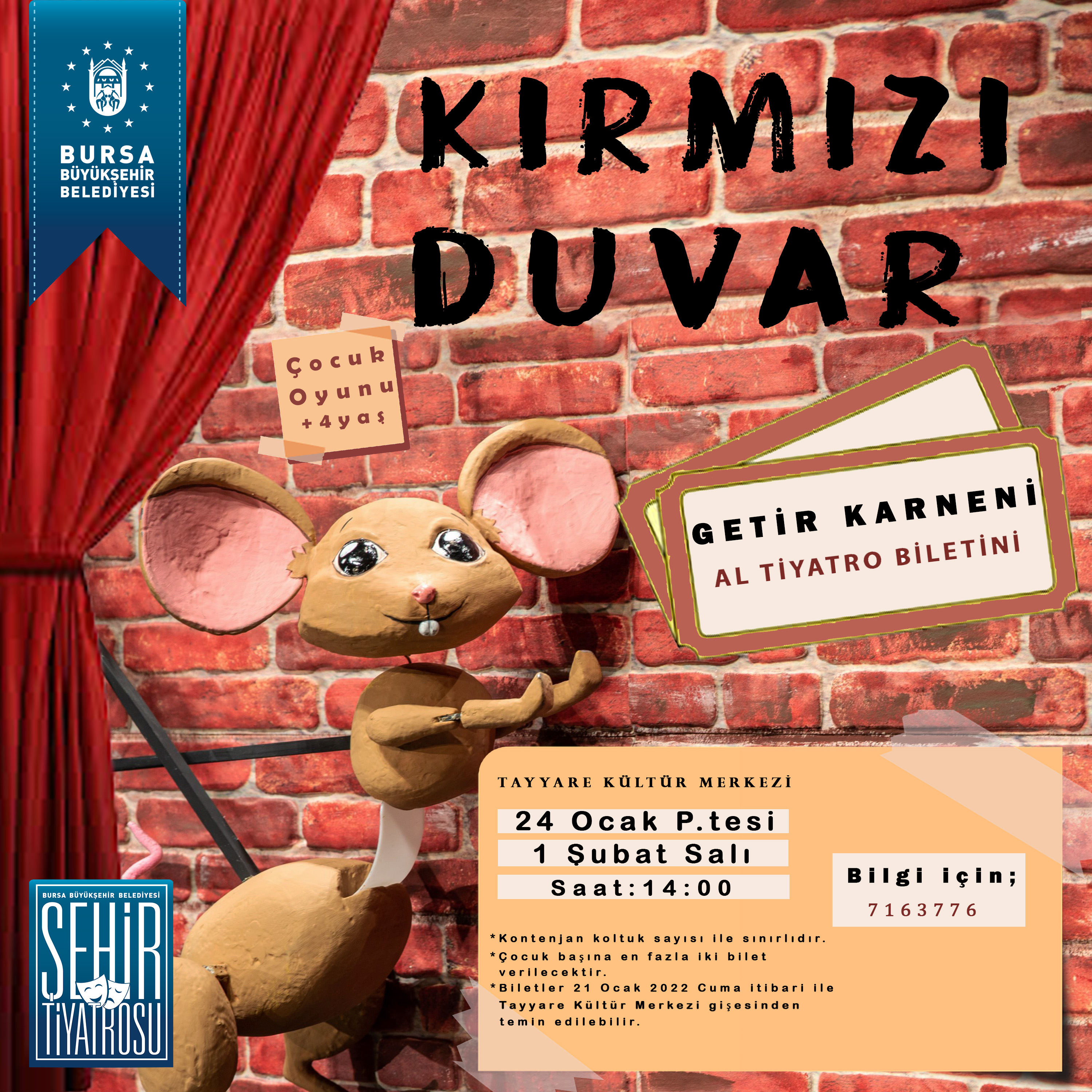 Bursa Büyükşehir Belediyesi, yarıyıl tatiline çıkan 4 yaş ve üzeri çocukları harika bir tiyatro oyunu ile ödüllendiriyor. Tayyare Kültür Merkezi’ne karnesini getiren çocuklar, Kırmızı Duvar adlı oyunu ücretsiz olarak izleyebilecek.