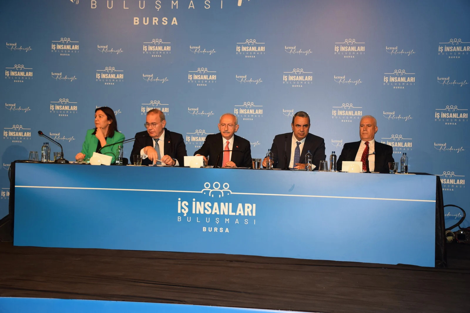 CHP Genel Başkanı Kemal Kılıçdaroğlu, Bursa’da sanayici ve iş insanlarıyla akşam yemeğinde bir araya geldi. Bursa İl Başkanı İsmet Karaca, Genel Başkan Yardımcısı Prof. Dr. Lale Karabıyık, Bursa milletvekilleri Nurhayat Altaca Kayışoğlu, Orhan Sarıbal, Yüksel Özkan ve Erkan Aydın’ın hazır bulunduğu toplantıda, başta Faik Öztrak olmak üzere CHP’nin üst düzey yöneticileri de Kılıçdaroğlu’na eşlik etti. Podyum Davet’in 1.300 kişilik salonunda gerçekleşen toplantıya Bursa iş dünyası da yoğun ilgi gösterdi.