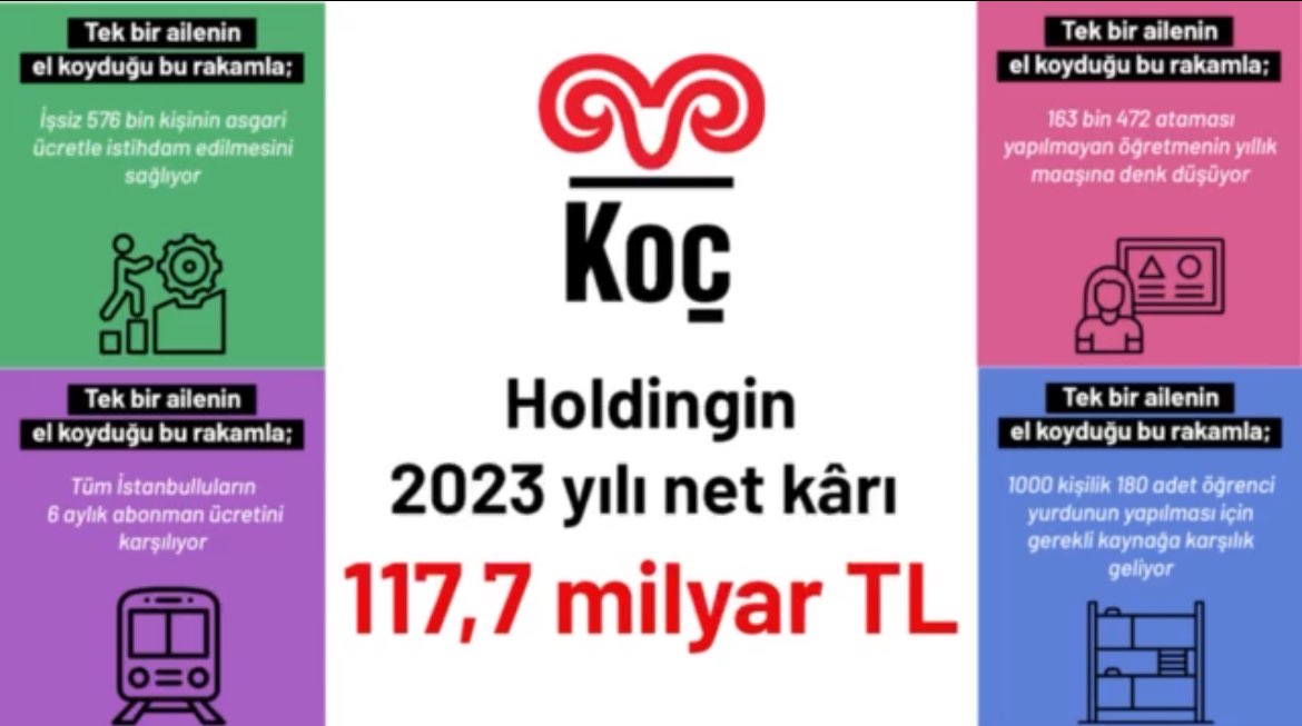 "Holdinglerin mal varlıkları ve kârları halkımıza feda olsun!" başlığıyla yürütülen kampanyada Yıldız ve Rönesans Holding’in ardından sıradaki durak Koç Holding. Yapılan açıklamada Koç Holding’in 2023 yılı net kârı olan 117,7 milyar TL ile işsiz 576 bin kişinin asgari ücretle istihdam edilebiliyor örneğin.