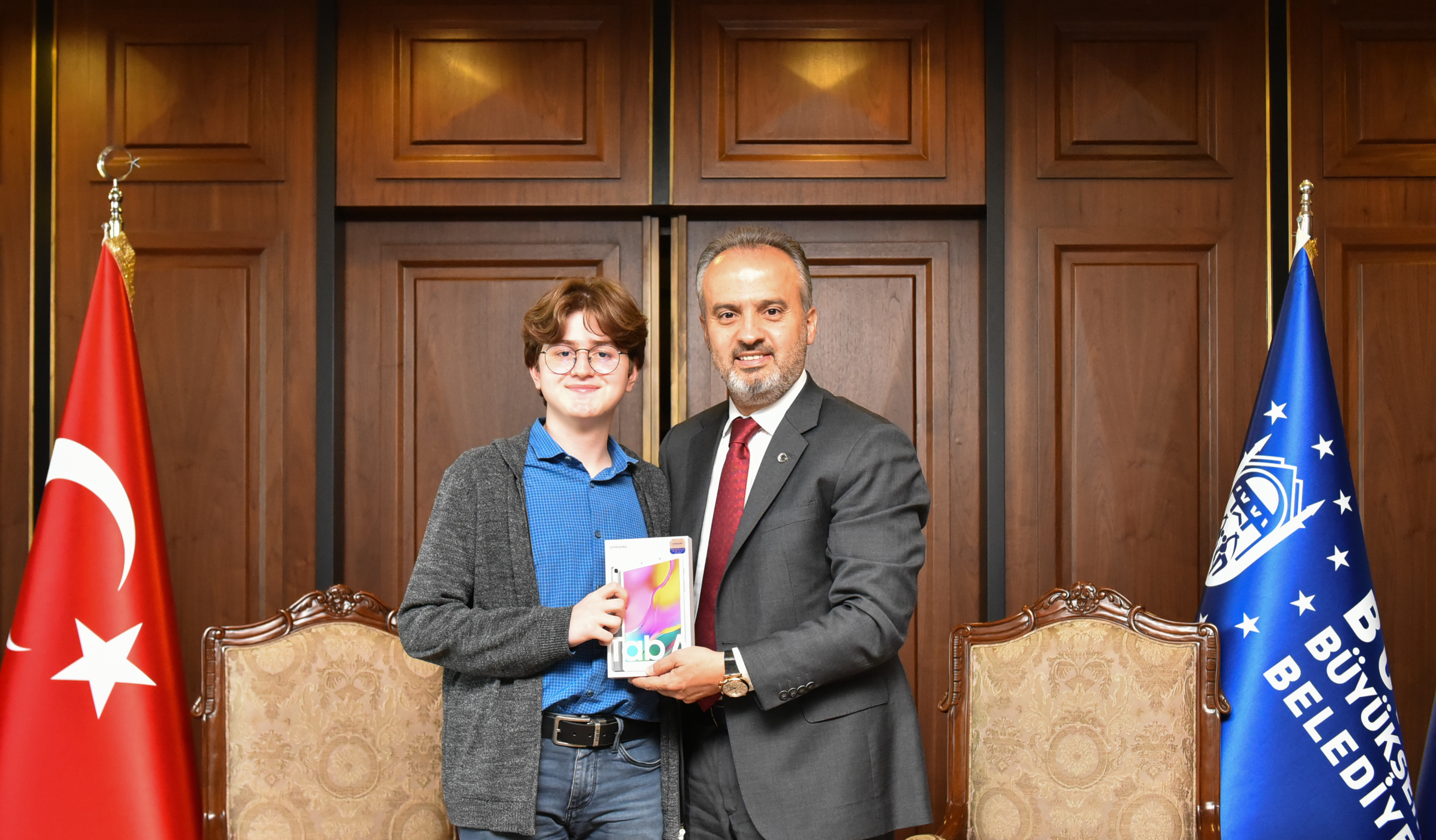 Bursa Büyükşehir Belediyesi tarafından Bursaray istasyonlarına konulan okuma kiosklarından yararlanan 50 bininci okur olan liseli Kahraman Akyüz, Başkan Aktaş tarafından tabletle ödüllendirildi.