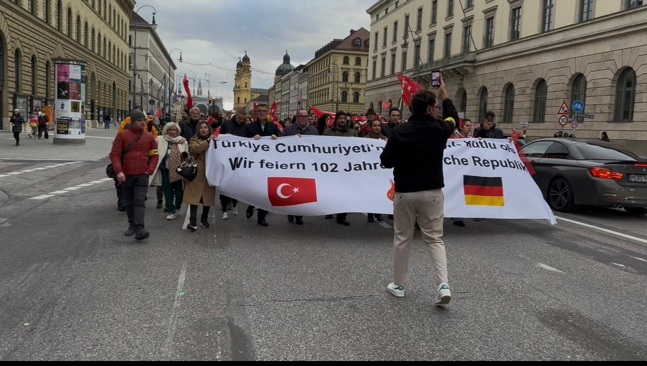 Odeonsplatz’dan başlayarak Siegestor yönüne gerçekleştirilen Cumhuriyet yürüyüşü, yüzlerce kişinin katılımıyla renkli görüntülere sahne oldu. Büyük Türk bayraklarıyla alanı dolduran kalabalık, “Yaşasın Cumhuriyet!” sloganlarıyla yürüyüşe anlam kattı.