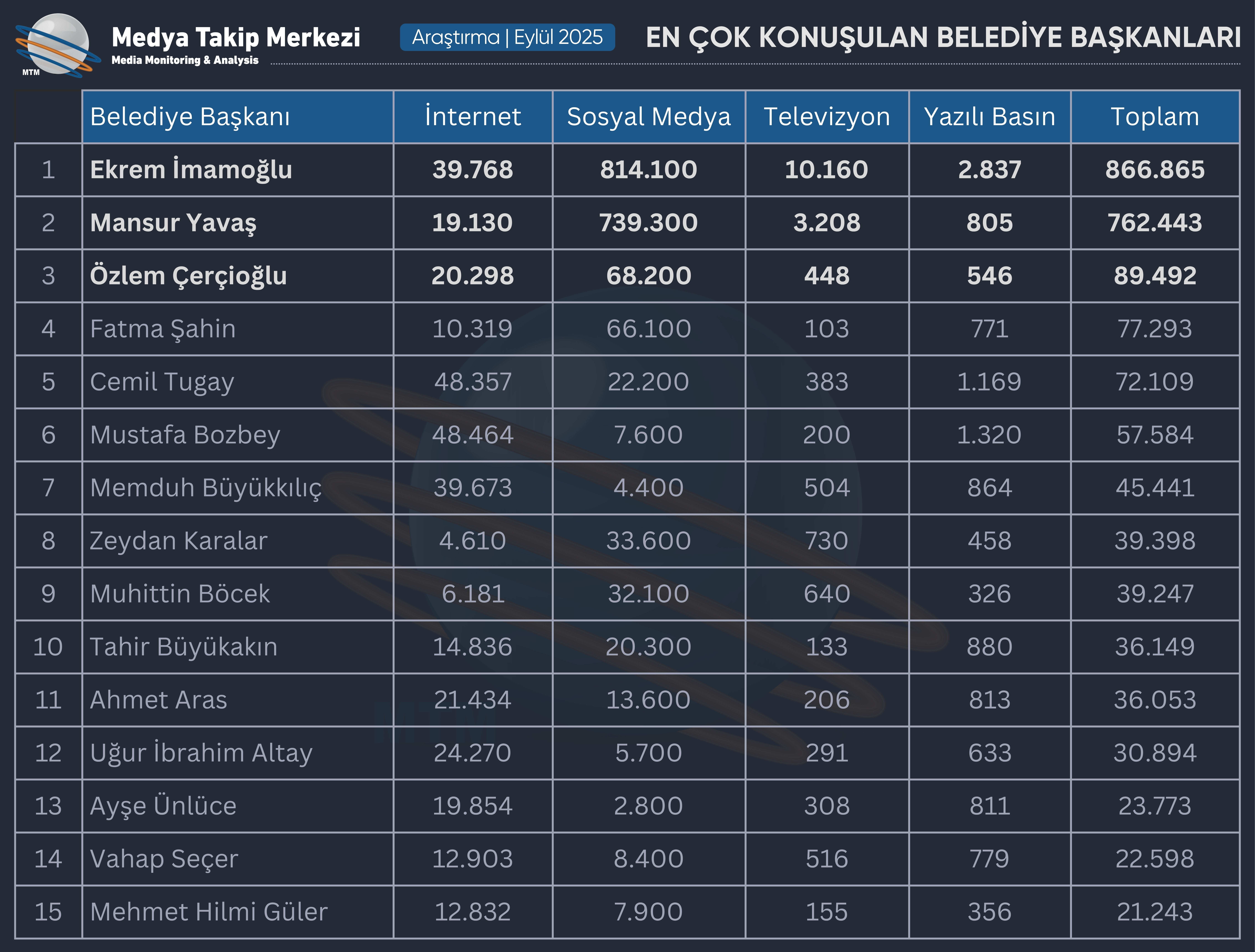 01–30 Eylül tarihleri arasında 10 bini aşkın internet sitesi, televizyon, yazılı basın ve sosyal medya platformu taranarak hazırlanan En Çok Konuşulan Belediye Başkanları Raporu, Bozbey’in kentsel dönüşüm, ulaşım ve çevre projelerinin basın ve dijital mecralarda dikkat çektiğini ortaya koyuyor. Bu görünürlük, Bozbey’in Bursa’daki çalışmalarının kamuoyunda daha fazla yankı bulduğunu gösteriyor.