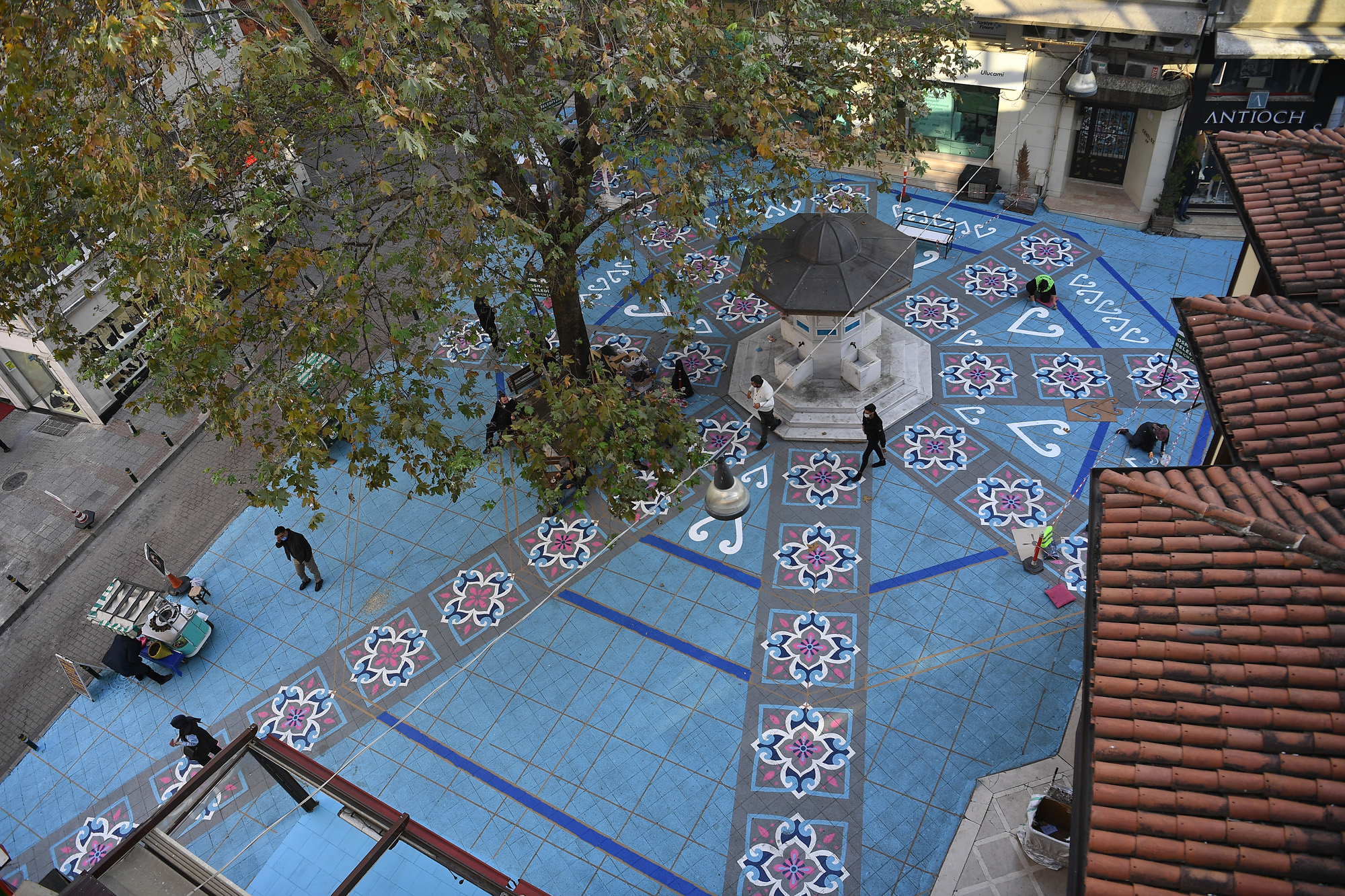 Osmangazi Belediyesi, Nalbantoğlu Çarşısı’nın zeminini çeşitli çini motifleriyle boyayarak, bölgeye estetik bir görüntü kazandırıyor.