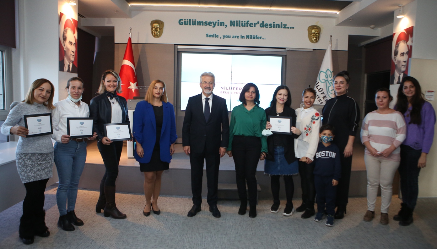 Nilüfer Belediyesi tarafından düzenlenen ‘Uygulamalı Girişimcilik Eğitimi’ne katılan kursiyerler, sertifikalarını Başkan Turgay Erdem’in elinden aldı.