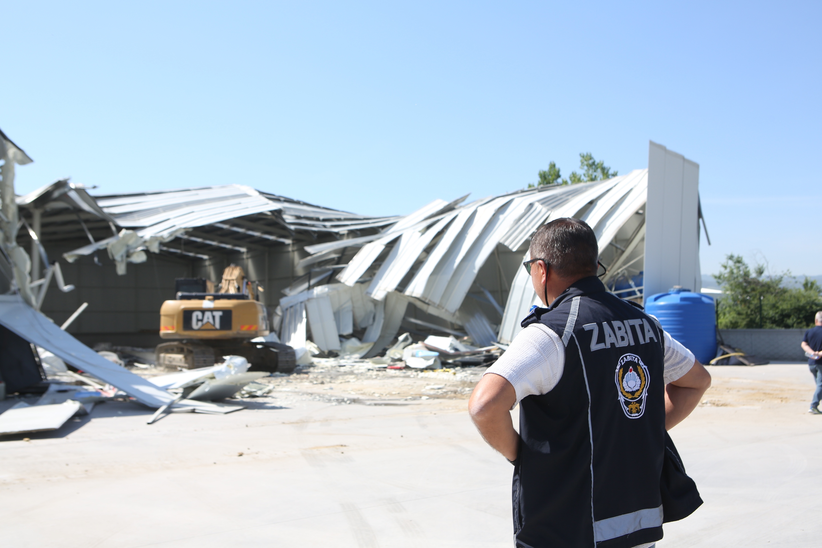 Nilüfer Belediyesi, Yaylacık Mahallesi'nde tarım arazisi üzerine kaçak olarak inşa edilen bir depoyu tamamen yıkarken, bir diğer depoyu da kullanılamaz hale getirdi.