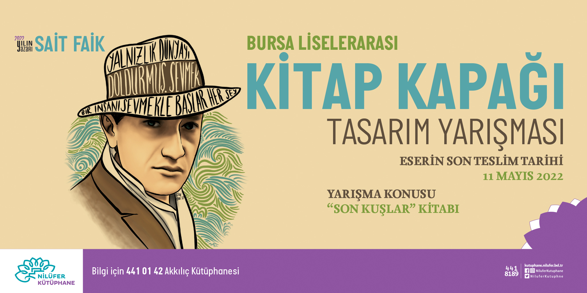 Nilüfer Belediyesi’nin 2022 yılının yazarı ilan ettiği Sait Faik Abasıyanık’ın Son Kuşlar isimli kitabı, lise öğrencilerinin yapacağı kapak tasarımına konu olacak. Sait Faik’in dil ve üslûbunu, eserlerini derinlemesine incelemek, bu incelemeyi farklı disiplinlerde gerçekleştirmek, yazarın genç kuşak tarafından daha yaygın biçimde tanınması ve benimsenmesini sağlamak, yaşadığı yıllardan bugüne eserlerinin genç zihinlerde oluşturduğu görsel algıyı belgelemek amacıyla düzenlenen Liselerarası Kitap Kapağı Tasarım Yarışması’nda süreç başladı.