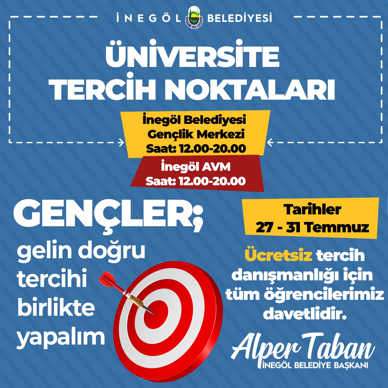 Belediye Başkanı Alper Taban, 27 Temmuz Perşembe günü itibariyle iki noktada kurulacak merkezlere ilişkin açıklama yaparak tüm öğrencileri bu alanlardan faydalanmaya davet etti. Başkan Taban, iki ayrı noktada üniversite tercih merkezi kurulacağını kaydederek; “Öğrencilerimizin geleceğini etkileyecek bu kararda en doğru adımı atmaları adına yanlarında olmak istedik. Bu nedenle hem İnegöl Belediyesi Gençlik Merkezimizde hem de İnegöl AVM’de iki ayrı tercih merkezi kuracağız. Her iki merkezimiz de 12.00 ile 20.00 arasında hizmet verecek. Tüm öğrencilerimizi ücretsiz danışmanlık hizmetinden faydalanmak üzere tercih çadırlarımıza bekliyoruz” dedi.