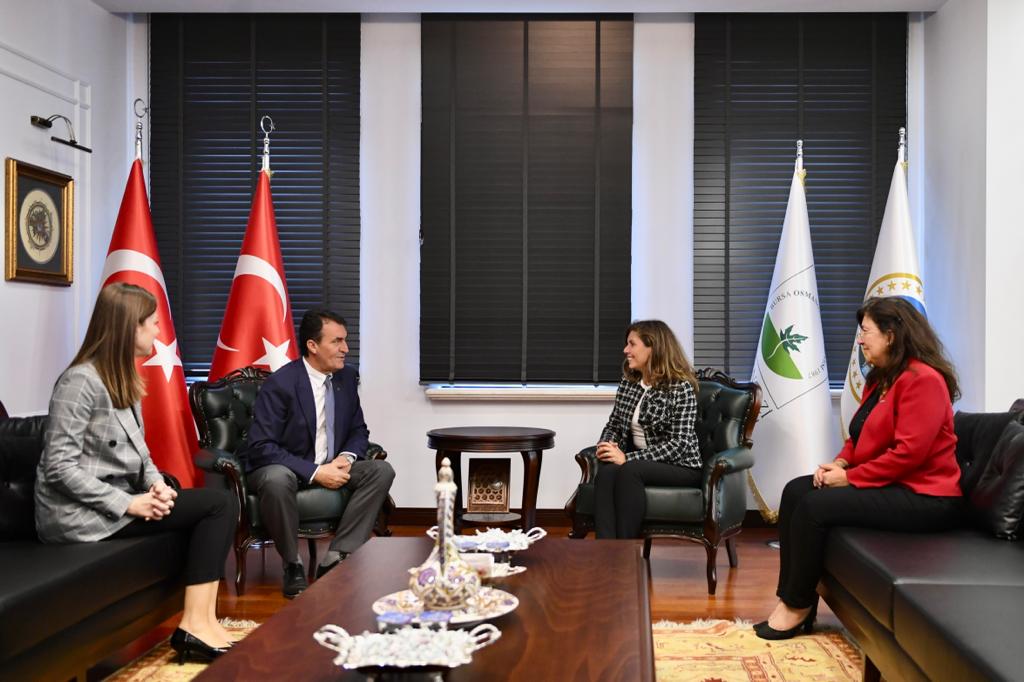 Bursa Mühendis Kadınlar Derneği (BUMKAD) Başkanı Ülfet Öztürk ve Yönetim Kurulu Üyeleri Ayşe Köksal ile Elif Kuş, Osmangazi Belediyesi Başkanı Mustafa Dündar’ı makamında ziyaret etti.