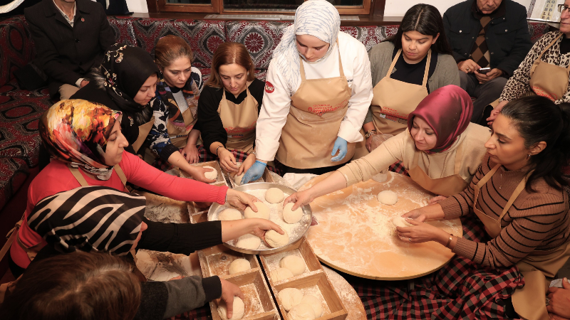 Program kapsamında Osmangazili kadınlar, Ulu Cami inşaatında çalışan işçilere ekmek yetiştirdiği rivayet edilen Şeyh Hamid-i Veli’nin asırlık tarifini uygulamalı olarak öğrenme imkânı buldu. Katılımcılar, un, su ve tuzdan oluşan hamuru geleneksel usullere uygun şekilde mayalayarak Somuncu Baba ölçülerinde ekmekler pişirdi.
