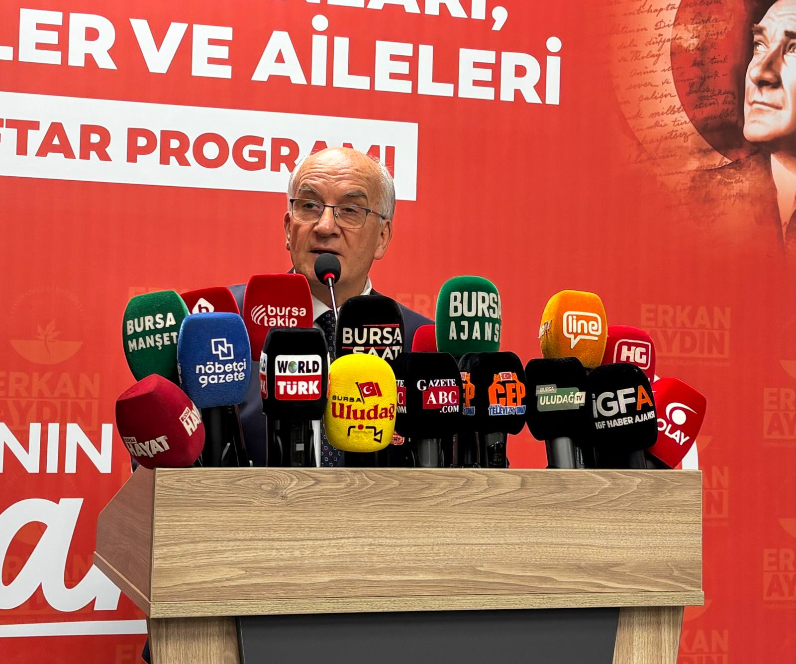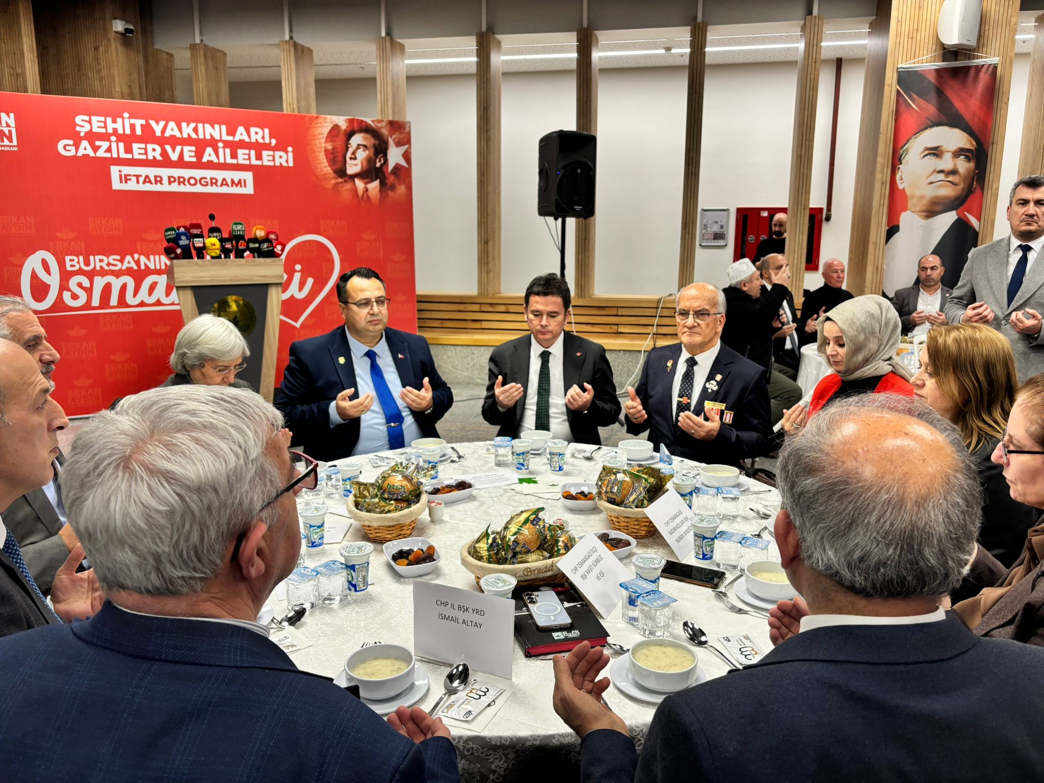 Başkan Erkan Aydın, “Bugün burada bu iftar sofrasında özgür ve bağımsız bir şekilde bir araya gelebiliyorsak, ezanlarımız minarelerimizden okunuyorsa, bayrağımız göklerde dalgalanıyorsa bunu başta Gazi Mustafa Kemal Atatürk’e, aziz şehitlerimize ve kahraman gazilerimize borçluyuz. Onlara olan minnet borcumuzu sözlerle ifade etmek mümkün değildir. Bu toprakları bizlere vatan yapanların fedakârlığını hiçbir zaman unutmayacağız” dedi.