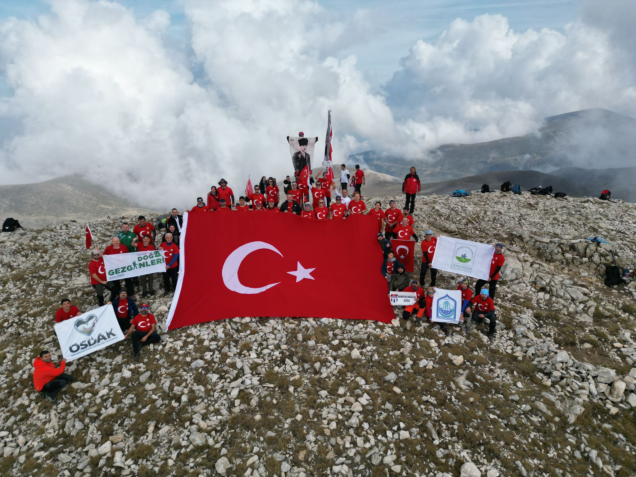 Dağcılar, ulaştıkları büyük zirvede Türk bayrağı açarak ve İstiklal Marşı'nı okuyarak Cumhuriyetin 100'üncü yılını kutladı.