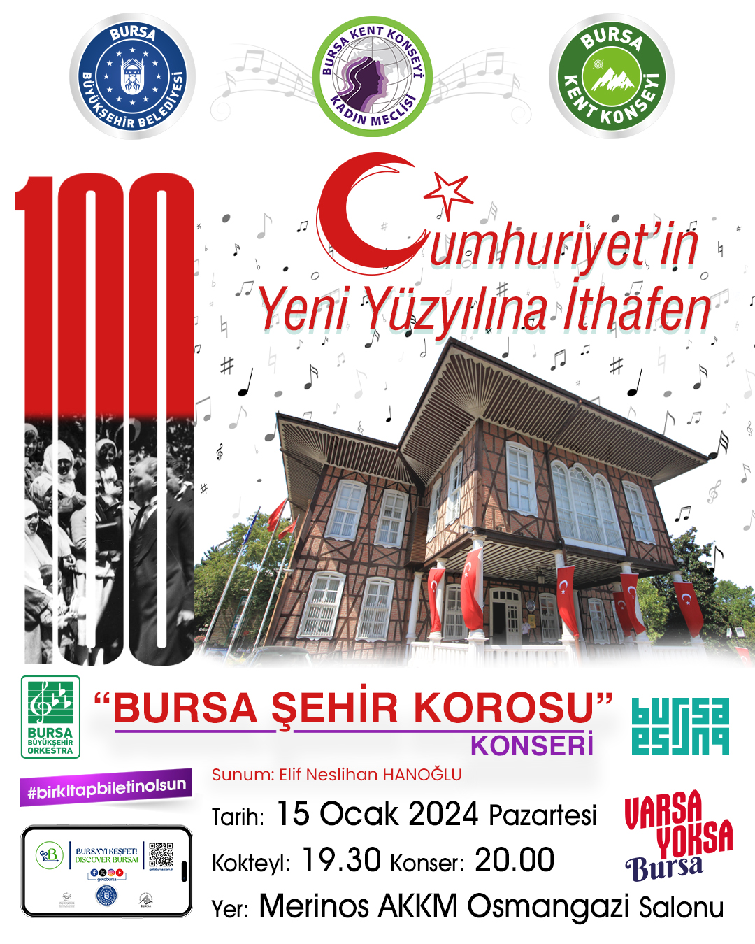 Cumhuriyetin 100. Yılına ithaf edilen Bursa Şehir Korosu Konseri, 15 Ocak 2024 Pazartesi günü saat 20.00’de Merinos AKKM Osmangazi Salonu’nda düzenlenecek. Bursa Kent Konseyi Kadın Meclisi tarafından Bursa Orkestra Şube Müdürlüğü işbirliğiyle gerçekleştirilen konserde, Bursa topraklarında yetişmiş ve Türk Sanat Müziğine emek veren 21 şef, 45 Türk Müziği Derneği, 200 korist ve 23 sazende Cumhuriyet döneminin en şanlı eserlerini seslendirecek. Ayrıca ‘Bir Kitap Biletin Olsun’ kampanyası için müzikseverlerden konsere gelirken, yanlarında bir kitap getirmeleri istendi. Toplanan kitaplar Hatay'da Bursa Büyükşehir Belediyesi'nin destekleriyle UEDAŞ'ın kurmuş olduğu Gelişim Kampüsü Kütüphanesi'ne gönderilecek.