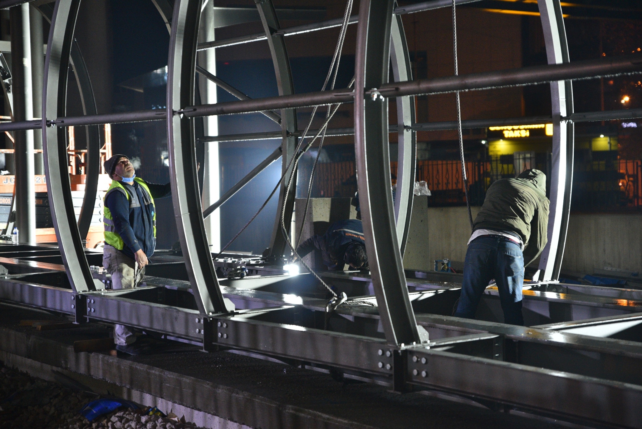 Bursa Büyükşehir Belediyesi’nin kenti demir ağlarla örme hedefleri doğrultusunda projelendirdiği Kent Meydanı Terminal tramvay hattında eksik imalatların tamamlanması için yapılan ihale kapsamındaki çalışmalar hızla devam ediyor. Toplam 9 bin 445 metre uzunluğunda 11 istasyonlu T2 hattının, T1 hattına entegrasyonu çalışmaları bir taraftan devam ederken, diğer taraftan hat üzerindeki eksik imalatlar da bir bir tamamlanıyor. İhale kapsamında hat üstyapısındaki eksik ray kaynakları, raylarının gerdirilmesi, ayarlamaların yapılması, makas montajları, makas kaynakları, eksik imalatların tamamlanması, hat üzerindeki 9 adet üstgeçit istasyonun dış cephe kaplamaları, cam ve prefabrik kaplama işleri gibi tüm eksiklikler gideriliyor. Trafiğin olumsuz etkilenmemesi için çalışmalar ağırlıklı olarak sokağa çıkma yasağı olan saatler arasında gerçekleştiriliyor. Hat üzerindeki 9 üst geçitten biri olan Gençosman üstgeçidinin çelik montajı da sabaha kadar süren çalışmalarla tamamlandı. Sokağa çıkma yasağının başladığı saat 21.00’da çalışmaların startını veren ekipler, günün ilk ışıklarına kadar süren hummalı çalışma ile üstgeçidin çelik montaj imalatını tamamladı.