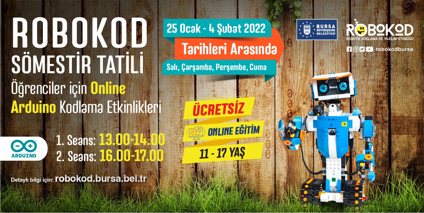 Tamamen ücretsiz olan eğitimlere, 7-10 yaş (2015-2012 doğumlu) ve 11-17 yaş arasındaki (2005- 2011 doğumlu) öğrenciler katılabilecek. Sömestr dönemi kapsamında 25 Ocak-4 Şubat tarihleri arasında 2 hafta süreyle yapılacak eğitimler, ‘Kodlamaya Giriş Eğitimi (Code.org)’ ve ‘Arduino Robotiğe Giriş ve Algoritma Eğitimi’ olarak 2 ana başlıktan oluşuyor. 25 Ocak-4 Şubat tarihleri arasında salı, çarşamba, perşembe ve cuma günleri Bursa Bilim ve Teknoloji Merkezi’nde (BTM) yüz yüze yapılacak eğitimin kayıtları, BTM’de etkinlikten yarım saat önce alınacak.