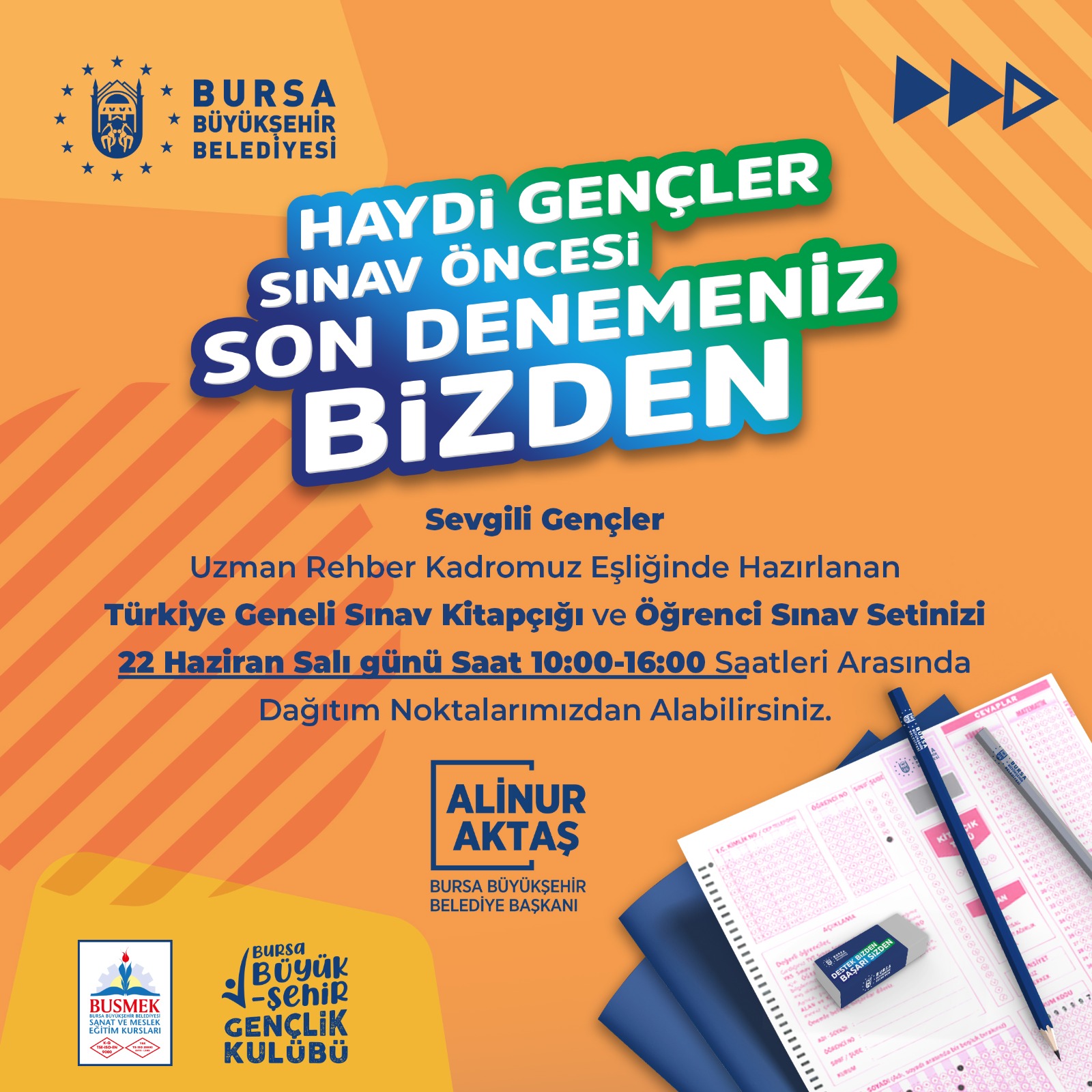 Bursa Büyükşehir Belediyesi, üniversite sınavı öncesinde uzman rehber kadro eşliğinde hazırlanan Türkiye Geneli Sınav Kitapçığı ve Öğrenci Sınav Setlerini üniversite adayları ile buluşturuyor.