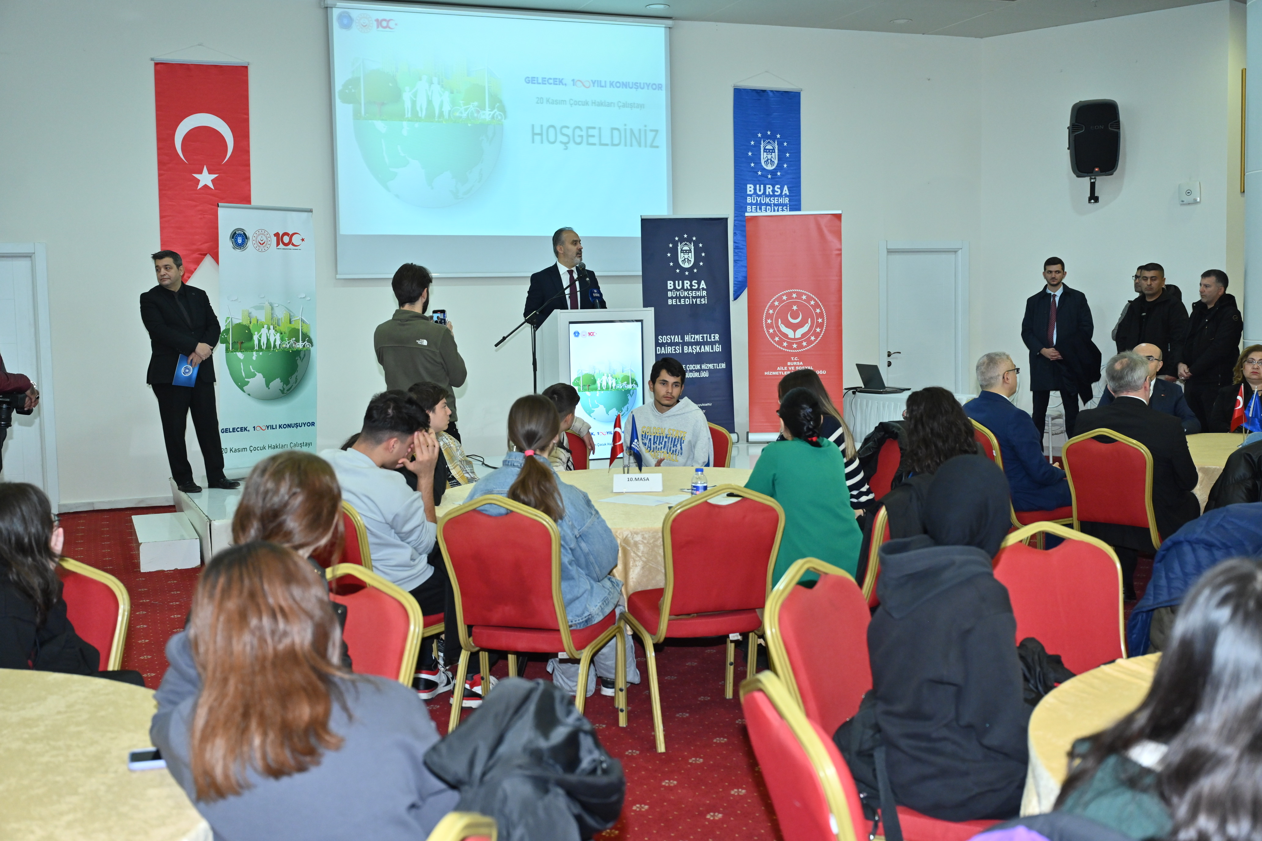 Bursa Büyükşehir Belediyesi Sosyal Hizmetler Daire Başkanlığı Aile, Kadın ve Çocuk Hizmetleri Şube Müdürlüğü tarafından 20 Kasım Dünya Çocuk Hakları Günü dolayısıyla Aile ve Sosyal Hizmetler İl Müdürlüğü işbirliğinde ‘Gelecek, yüzyılı konuşuyor’ konulu çalıştay düzenlendi. Atatürk Kongre Kültür Merkezi’ndeki programa, Bursa Büyükşehir Belediye Başkanı Alinur Aktaş’ın yanı sıra Bursa Valisi Mahmut Demirtaş, İl Milli Eğitim Müdürü Dr. Ahmet Alireisoğlu, Aile ve Sosyal Hizmetler İl Müdürü Faruk Uysal, Bursa Kent Konseyi Başkanı Şevket Orhan ve 150 civarında öğrenciler katıldı.
