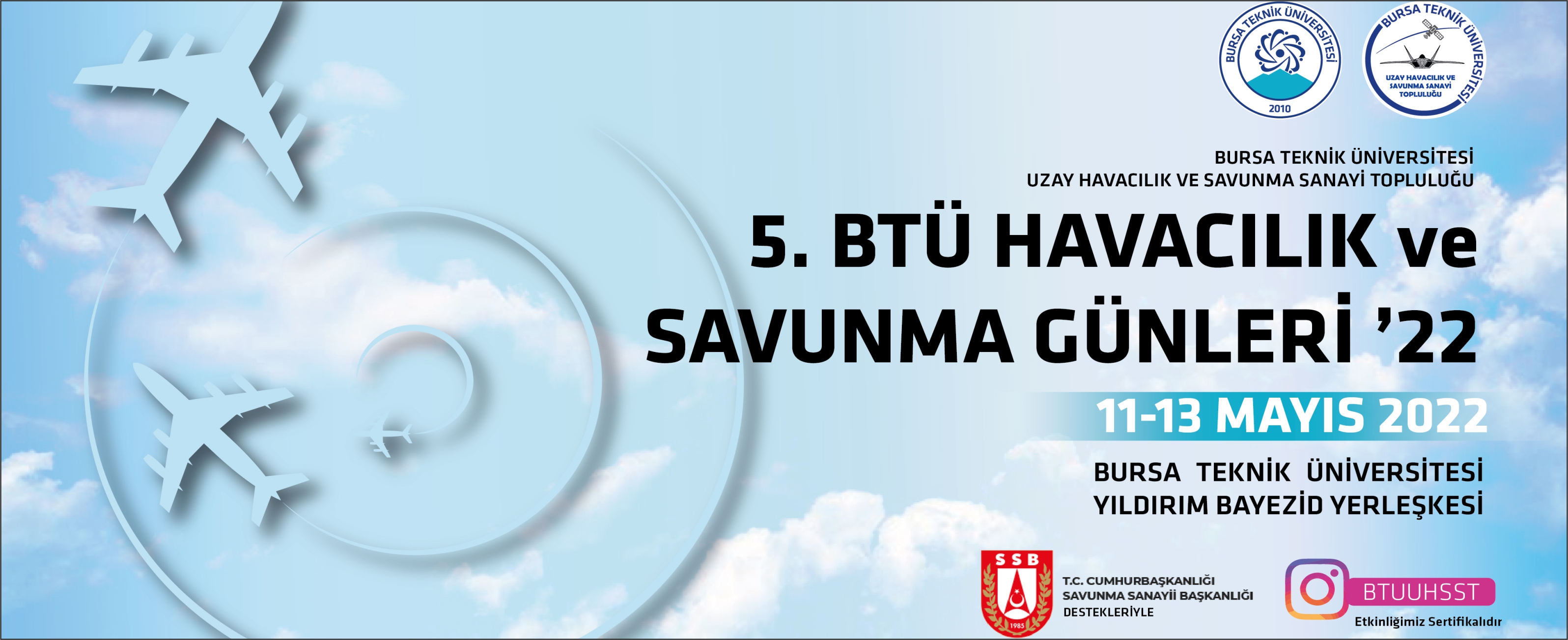 Cumhurbaşkanlığı Savunma Sanayii Başkanlığıdestekleriyle düzenlenen ‘5. BTÜ Havacılık ve Savunma Günleri’kapsamındaki etkinlikler,11-13 Mayıs 2022 tarihlerindeBursa Teknik Üniversitesi Yıldırım Bayezid Yerleşkesinde gerçekleştirilecek. TÜBİTAK SAGE, ASELSAN, TUSAŞ, ROKETSAN, HAVELSAN, TEI, FNSS, CEZERİ, ASİSGUARD, METEKSAN gibi öncü kurumların üst düzey yöneticileri seminerlerde öğrencilerle bir araya gelirken firmalar ürünlerini stantlarında sergileyecek. Bursa Büyükşehir Belediyesi, Yıldırım Belediyesi, Bursa Ticaret ve Sanayi Odası (BTSO), ASELSAN, TEİ ve ROKETSAN’ın desteklediği organizasyonun iletişim sponsorluğunu ise TÜRKSAT üstleniyor.