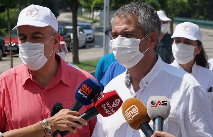 Bursa Tabip Odası Yönetim Kurulu Başkanı Doç. Dr. Alpaslan Türkkan ve yönetim kurulu üyeleri Bursa İl Sağlık Müdürlüğü önünde bir basın açıklaması gerçekleştirdi. Çok sayıda basın mensubunun takip ettiği açıklamada Türkkan, sağlık çalışanlarının sorunlarının pandemi ile başlamadığını belirterek, “Pandemi öncesi yaşadığı sorunlarının üzerine COVID-19 vakaları, pandeminin ‘virüs yükü’ ve yönetsel hatalar bindi” ifadelerini kullandı. COVID-19 pandemisi gibi kriz dönemlerinde sağlık çalışanlarının gösterdiği emeğin maddi karşılığının bulunmadığını belirten BTO Başkanı Alpaslan Türkkan, “Evde eşini, çocuğunu bırakarak, hastalığı anne babasına bulaştırma endişesiyle ailesinden ayrı yaşayarak, kan ter içinde bırakan giysi ve maskeler içinde günlerce COVID-19 polikliniklerinde hasta bakmanın bedeli yoktur” dedi.