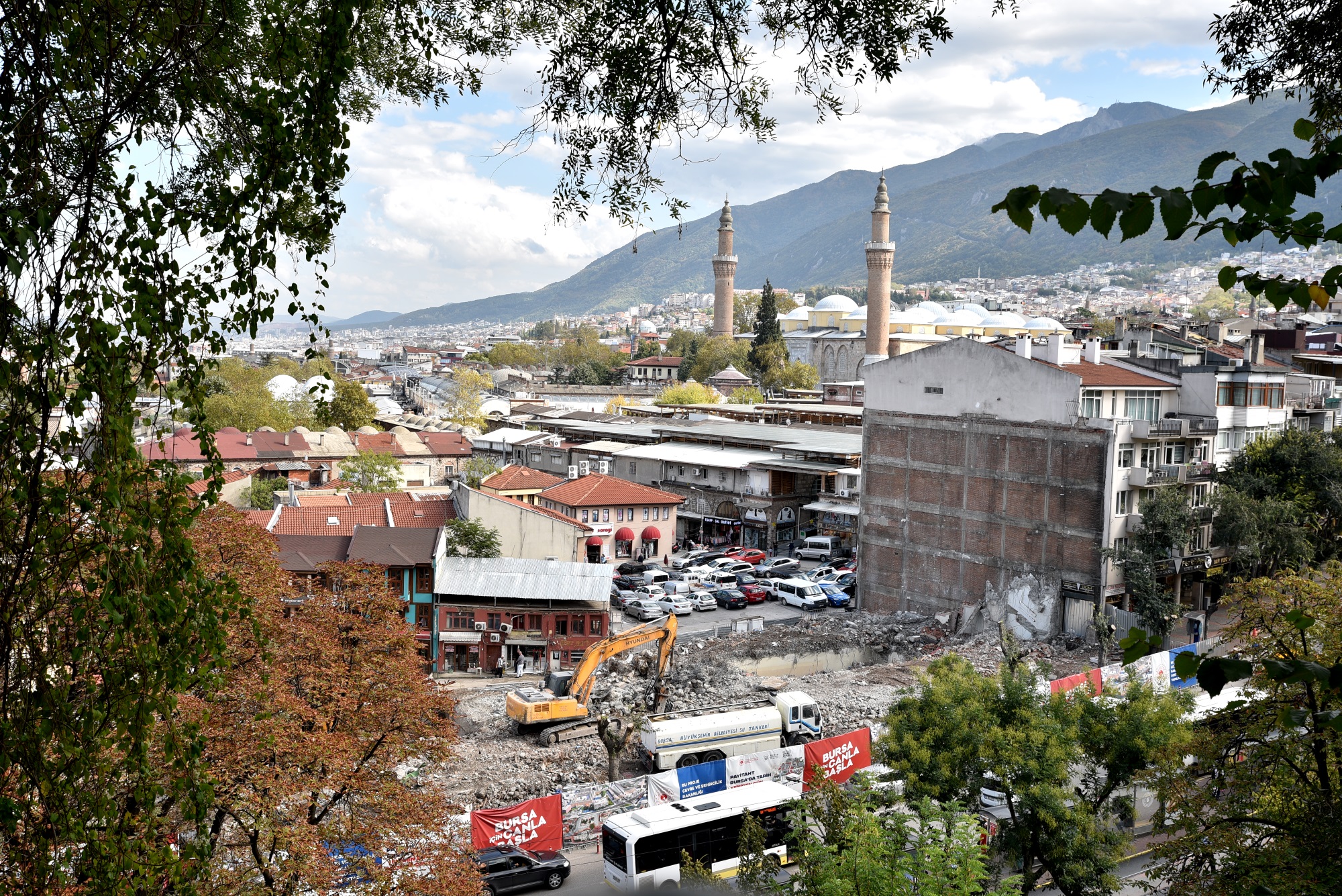 Osmanlı'nın ilk başkenti olan Bursa'da 14. yüzyılda oluşmaya başlayan, 16. yüzyılda han, bedesten ve çarşıların oluşumuyla gelişimini tamamlayan Tarihi Çarşı ve Hanlar Bölgesi’ni etrafını çevreleyen binalardan arındırarak yeniden gün yüzüne çıkaracak proje hız kesmeden devam ediyor. Bursa Büyükşehir Belediyesi’nin, Çevre ve Şehircilik Bakanlığı tarafından da desteklenen projesinde, çalışmalar kapsamında Kızılay, İşkur ve Merkez Bankası binalarının yıkımı tamamlanırken, hafriyat kaldırma çalışmaları da tüm hızıyla devam ediyor. Henüz 2 ayı bile bulmayan zamanda yapılan çalışmalar, daha şimdiden kente büyük bir değer kattı. Osmanlı’nın 4’üncü sultanı Yıldırım Beyazıt tarafından Niğbolu Zaferi’nin adağı olarak yaptırılan, İslam âleminin en yüksek mertebedeki 5’inci büyük mabedi kabul edilen 600 yıllık Ulu Cami, artık Cemal Nadir Caddesi üzerinden de görünmeye başladı. Öte yandan Ulu Cami ile Tophane ve Hisar Bölgesi arasında adeta perde görevi gören binaların kalkmasıyla iki tarihi bölge arasındaki görsel bağlantı da sağlanmış oldu.