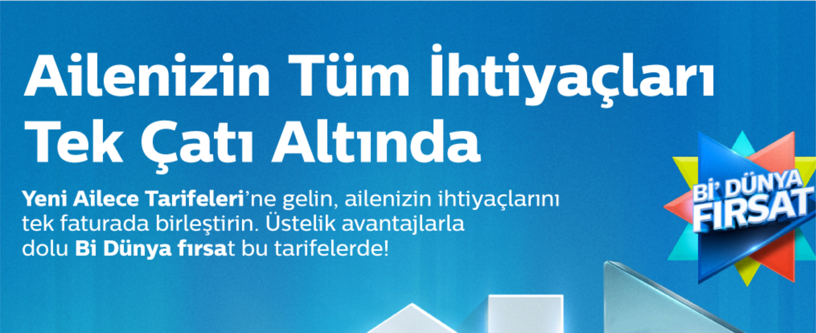 Tatilden eğitime, eğlenceden mobilya ürünlerine kadar birçok kategoride Bi’ Dünya Fırsat ile müşterilerine avantajlar sunan Türk Telekom, Ailece Tarifeler kapsamında müşterilerine indirim imkânı sağlıyor. Ailece Tarifeleri müşterilerine sunulan Bi’ Dünya Fırsat ayrıcalıklarından bazıları şu şekilde; MentalUP’da 6 aylık ödeme ile 12 ay kullanım, D&R mağazalarında geçerli 150 TL ve üzeri alışverişlerde 30 TL indirim, Kırtasiye Dünyası’ndan online alışverişlerde geçerli %15 indirim, A101.com.tr’de 300 TL ve üzeri alışverişlerde 50 TL indirim ve Pizza Lazza’da geçerli %20 indirim.