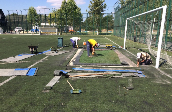 Bursa'nın sporda da marka kent olması hedefiyle eğitim kurumlarına spor salonları, amatör kulüplere saha ve tesis binaları, her branşa özel spor tesisleri kazandıran Bursa Büyükşehir Belediyesi, pandemi sürecinde de amatör spor kulüplerine desteğini sürdürüyor. Korona virüsle mücadele kapsamında alt liglere ara verilmesini de fırsata dönüştüren Büyükşehir Belediyesi Gençlik ve Spor Hizmetleri Şube Müdürlüğü bünyesindeki 10 tesiste sentetik futbol sahalarını bakıma aldı. Bakım onarım çalışmaları kapsamında granül eklemesi yapılıyor, penaltı noktaları değiştiriliyor, yedek oyuncu kulübelerinin önlerine beyaz renkte ihlal çizgisi yerleştiriliyor, muhtelif yerlere yeşil halı kullanılarak ceza sahalarının önleri yenileniyor, silis kum atılıyor, lokal tadilatlar yapılıyor ve sahalar fırçalanıp tüm eksiklikler gideriliyor ediliyor.