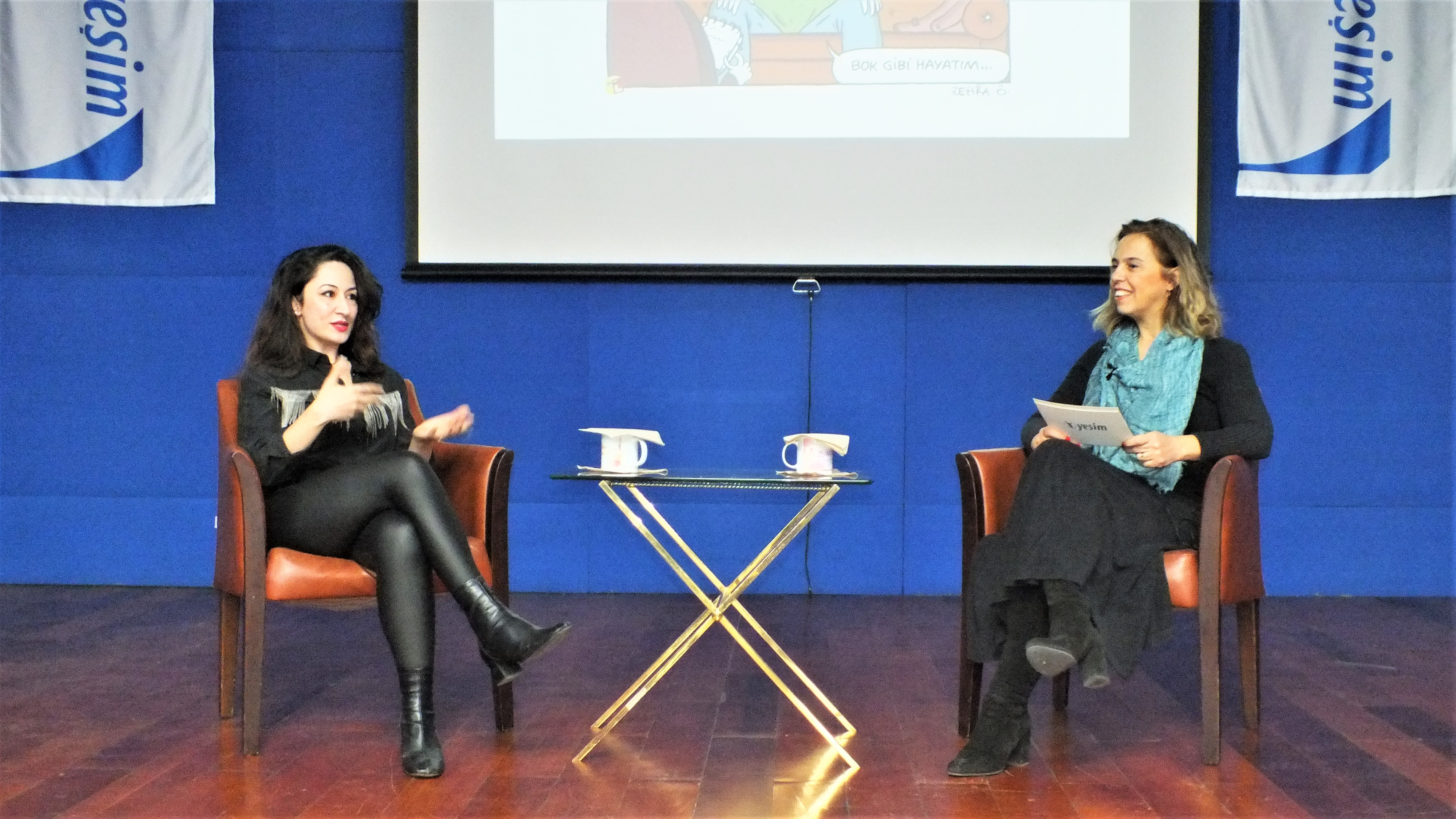 Yeşim Grup’ta “8 Mart Dünya Kadınlar Günü”ne özel organize edilen “Mizahın İyileştiri Gücü Söyleşisi”, Yeşimlilerin yoğun katılımıyla Büyük Konferans Salonu’nda gerçekleştirildi. Yeşim Grup Kurumsal İletişim Direktörü Dilek Cesur’un moderatörlüğünü yaptığı söyleşiye, Leman ve Ot Dergisi karikatüristlerinden Zehra Ömeroğlu konuşmacı olarak katıldı. Ömeroğlu, günün anlam ve önemi kapsamında kadının sektördeki yerine ve afet dönemlerinde mizahın pozitif etkilerine değindi.