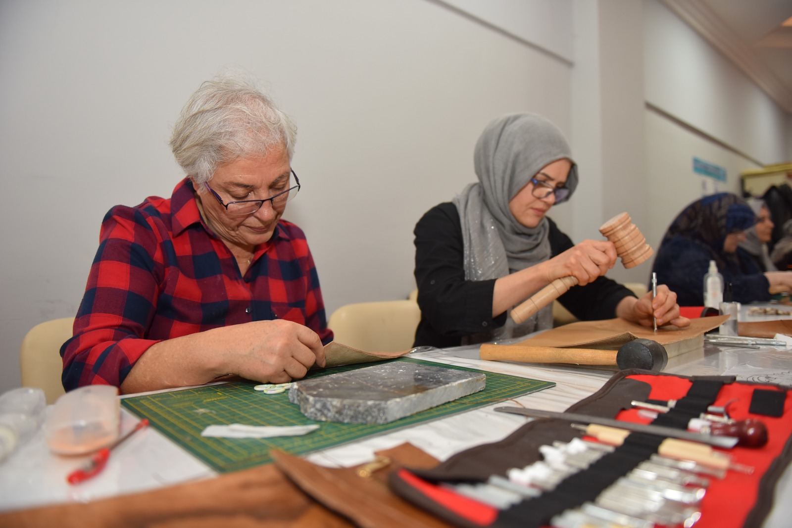 Yıldırım Belediyesi Meslek Edindirme Kursları (YIL-MEK) tüm hızıyla devam ediyor. Yıldırım Belediyesi, Meslek ve Sanat Eğitim kursları kapsamında Deri Tasarımı branşı ile deri modasının inceliklerini meraklılarına öğretiyor. Deri Tasarımı kursiyerleri, aldıkları eğitim ile çanta ve elbise gibi kişiye özel tasarımlar ortaya çıkarıyorlar. Derinin işlenerek yapıldığı şık tasarımlar, kalitesi ile göz dolduruyor. Barış Manço Kültür Merkezi’nde haftanın 2 günü verilen derslerde, işlenmiş gerçek sığır derisi üzerine özel çivi uçlarıyla craft adı verilen malzemelerle dövülerek şekil verilen ürünler alıcılarına sunulmak için hazırlanıyor.
