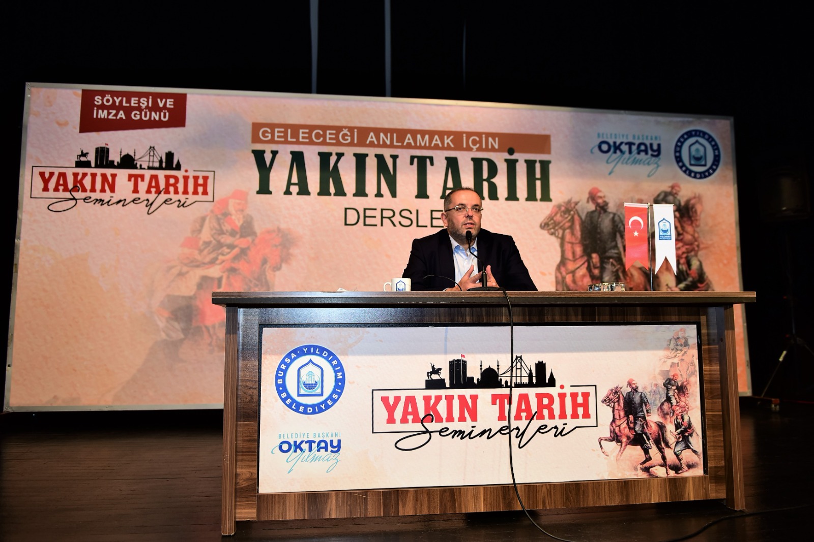 Yıldırım Belediyesi tarafından düzenlenen ‘Yakın Tarih Seminerleri’nin ilk konuğu Millî Savunma Üniversitesi Rektörü Prof. Dr. Erhan Afyoncu oldu. Program, Erhan Afyoncu’nun ‘Geleceği Anlamak İçin Yakın Tarih Dersleri’ kitabını imzalayarak okurlarıyla buluşması ile başladı. Ardından ‘Geleceği Anlamak İçin Yakın Tarih Dersleri’ konusu üzerine konuşan Erhan Afyoncu, Osmanlı Devleti’nden 15 Temmuz’a kadar geçen serüveni anlattı ardından katılımcılardan gelen soruları yanıtladı. Barış Manço Kültür Merkezi'nde düzenlenen seminere gençler yoğun ilgi gösterdi.