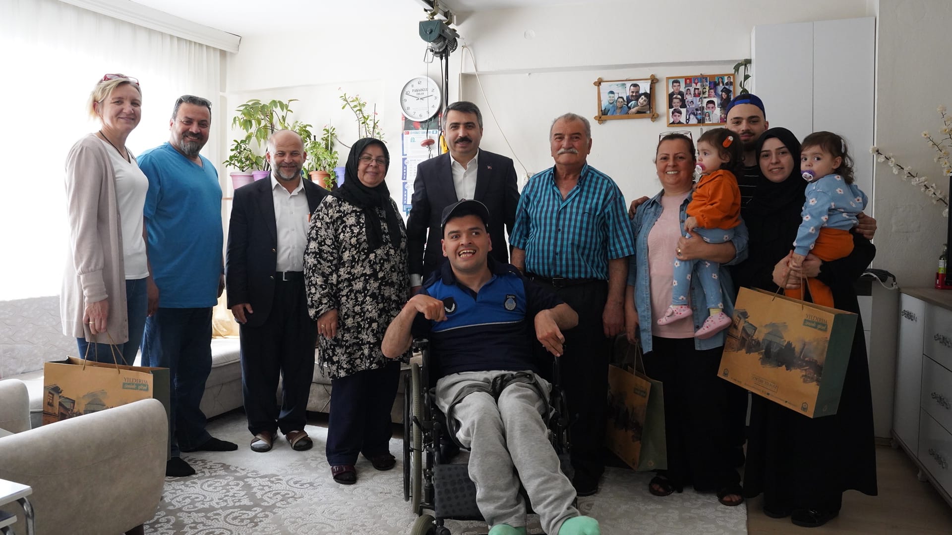 Hane halkının bayramını tebrik eden Belediye Başkanı Oktay Yılmaz, zabıta hayranı olan Özkaya’ya bayram dolayısıyla zabıta üniforması hediye etti. Yıldırım’ın yeni zabıta memuru Özkaya’yı tebrik edip görevinde başarılar dileyen Başkan Oktay Yılmaz, “İlçemizde yaşayan engelli vatandaşlarımızın engelsiz bir hayat sürmesini sağlamak için büyük gayret gösteriyoruz. Kendilerini evlerinde ziyaret ederek onlarla sohbet ediyor, özel günlerinde yanlarında bulunarak yalnız olmadıklarını gösteriyoruz. İsteklerine anında cevap vermeye çalışıyoruz. Ramazan Bayramı dolayısıyla bizleri evine davet eden Önder kardeşimizin hanesine misafir olduk, kendisi ve kıymetli ailesiyle bayramlaştık. Zabıtaları çok seven kardeşimize zabıta üniforması hediye ettik. Bundan sonra mahalle Önder’e emanet” dedi. Öte yandan mutluluğu gözlerinden okunan Önder Özkaya ve ailesi, anlamlı hediyesinden dolayı Başkan Oktay Yılmaz’a teşekkür etti. Başkan Yılmaz, üniformasını giyen Önder Özkaya ile hatıra karesi çektirdi.