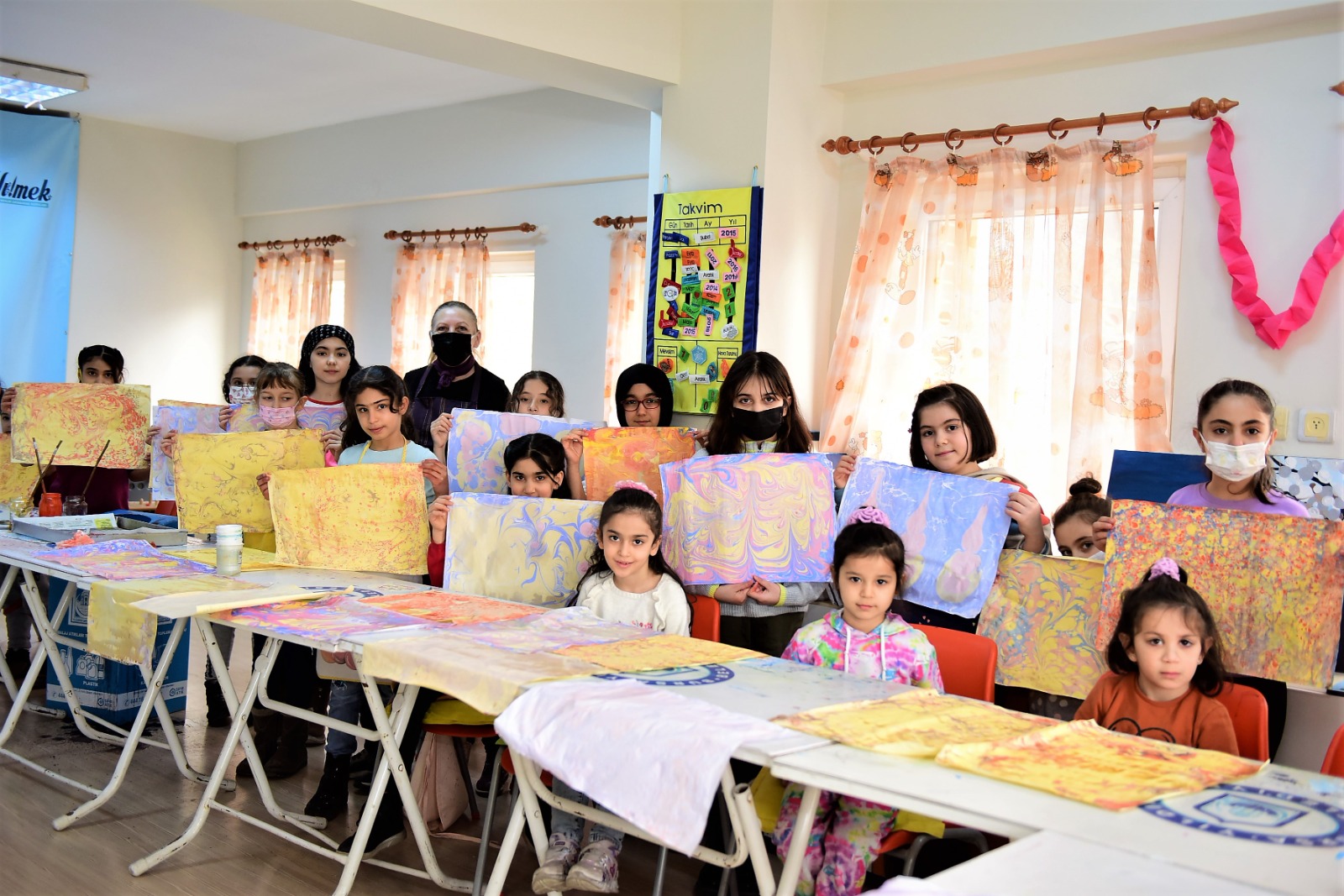 Yıldırım Belediyesi’nin, Erikli Çocuk Aktivite Merkezi’nde çocuklara yönelik verdiği eğitimler tüm hızıyla devam ediyor. Yıldırım Kaymakamlığı, Yıldırım İlçe Milli Eğitim Müdürlüğü ve Yıldırım Halk Eğitim Merkezi Akşam ve Sanat Okulu ile birlikte düzenlenen kurslarda 7-16 yaş grubundaki çocuklar tiyatro-drama, akıl ve zeka oyunları, satranç, mangala, gitar, çocuk korosu, ebru ve resim branşlarında eğitimler alıyor. Çocukların eğitim yaşamlarının yanında sosyal ve kültürel açıdan da donanımlı bireyler olarak yetişmesine katkı sağlamak amacıyla çalışmalar yürüten Yıldırım Belediyesi, merkezde eğitim gören çocuklara yönelik ebru workshop etkinliği düzenledi. Düzenlenen workshop ile çocuklar, ebru sanatının renkli dünyasına adım attılar.