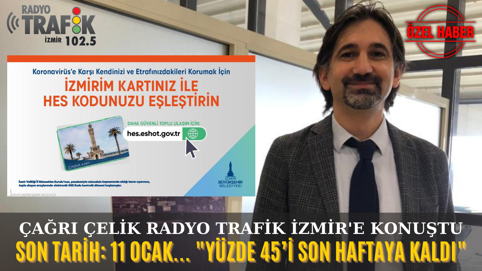 İzmir Büyükşehir Belediyesi ESHOT Genel Müdürlüğü Ulaşım Teknolojileri Dairesi Başkanı Avukat Çağrı Çelik, Radyo Trafik İzmir’de yayınlanan “Ulaşıma Dair Özel” programında Esra Balkanlı’nın sorularını yanıtladı. Çelik, son haftasına girilen İzmirim Kartlar ile HES Kodu eşleştirilmesi konusunda İzmirlilere çağrıda bulundu.