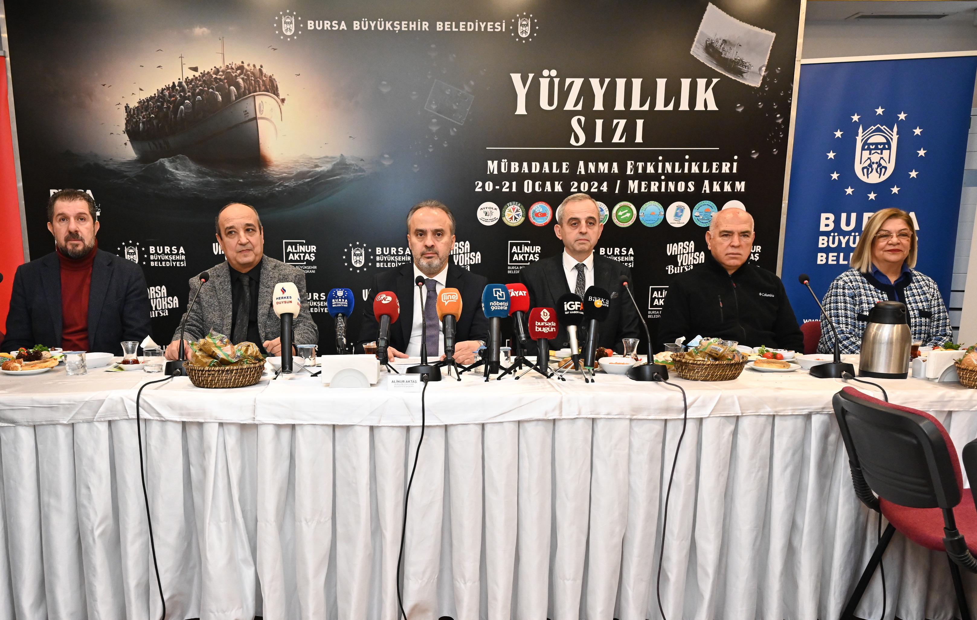 Bursa Büyükşehir Belediye Başkanı Alinur Aktaş, konuşmasına mübadeleyi konu alan İhsan Tevfik’in ‘Selânik Gazeli’nden mısralar okuyarak başladı. Mübadelenin, unutulması mümkün olmayan, acılarla dolu hikâyelerin yaşandığı bir yolculuğun adı olduğunu dile getiren Başkan Aktaş, “Mübadele, göç etmeye mecbur bırakılan insanların, etkisinden çıkamadığı büyük bir travmanın karşılığıdır. 100 yıl önce açılan bu yara hâlâ kapanmadı. Mübadil Türkler, kırık dökük hayatlarının, yitirilen anılarının ve paramparça olmuş aile bağlarının acısını ilk günkü gibi yüreklerinde taşıyor. 1923 Lozan Konferansı’nda Türk ve Yunan devletleri arasında imzalanan 'nüfus mübadelesi sözleşmesi' sonrası gerçekleşen, Türk ve Rumların zorunlu değişimini içeren bu süreç, binlerce insanın yaşamını darmadağın eden bir trajedi olarak tarihe geçti. İki devlet arasında yapılan bu acı dolu anlaşma, adeta geçmişin kök salmış bağlarını kopartarak, yıllarca bir arada yaşamış olan Türk ve Rum halklarını yürek burkan bir ayrılığa ve bilinmeyen bir geleceğe sürükledi” dedi.