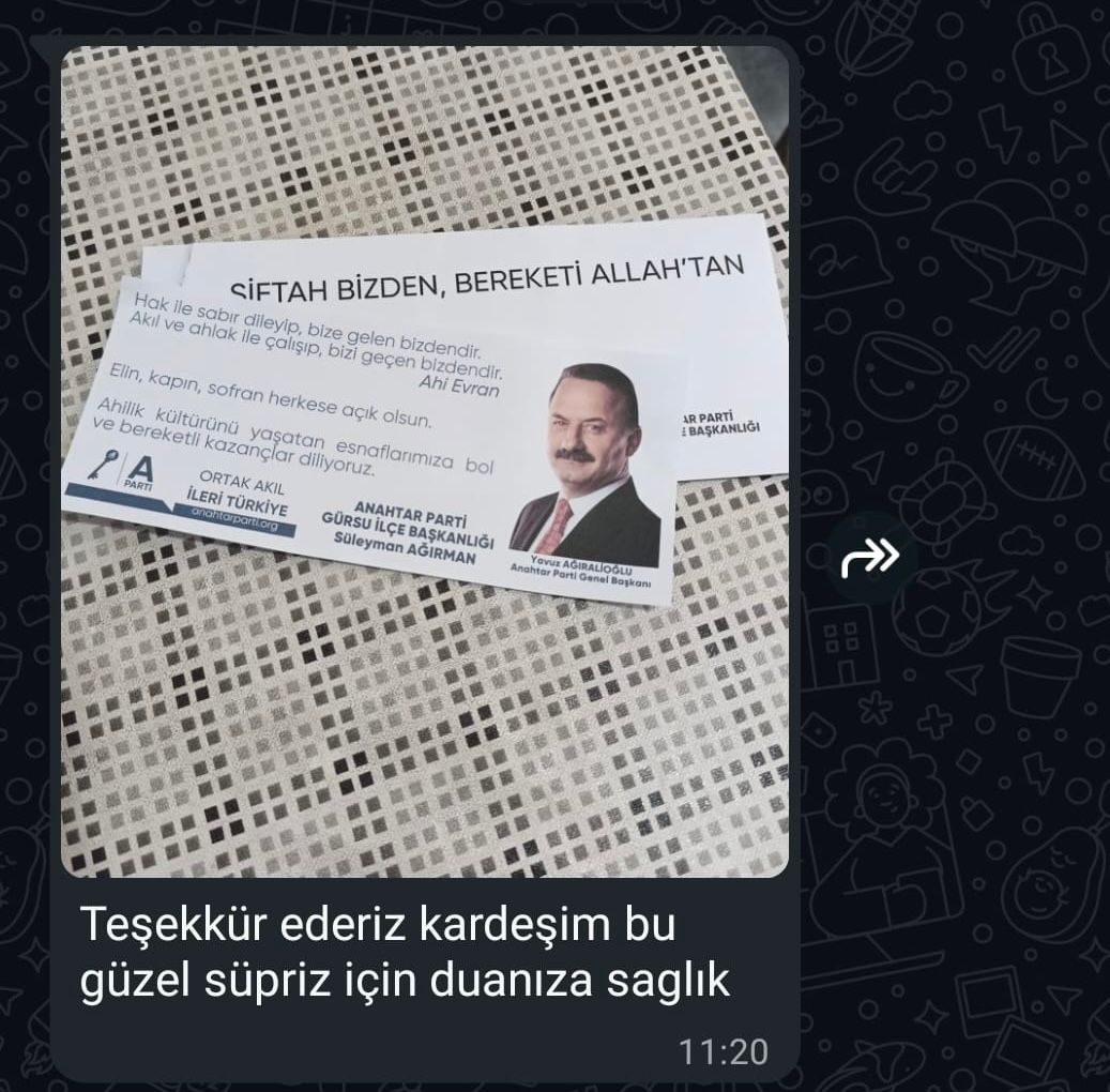A Parti Gürsu İlçe Başkanı Süleyman Ağırman ve ilçe teşkilatı tarafından zor günler geçiren esnafa anlamlı bir dayanışma örneği sergilendi. Akşam saatlerinde dükkanını kapatıp evine giden esnafların kapısının altından, üzerinde “Siftah bizden, bereketi Allah’tan” yazılı zarflar bırakın Ağırman ve teşkilatı, eşine az rastlanır bir programa imza atmış oldu.